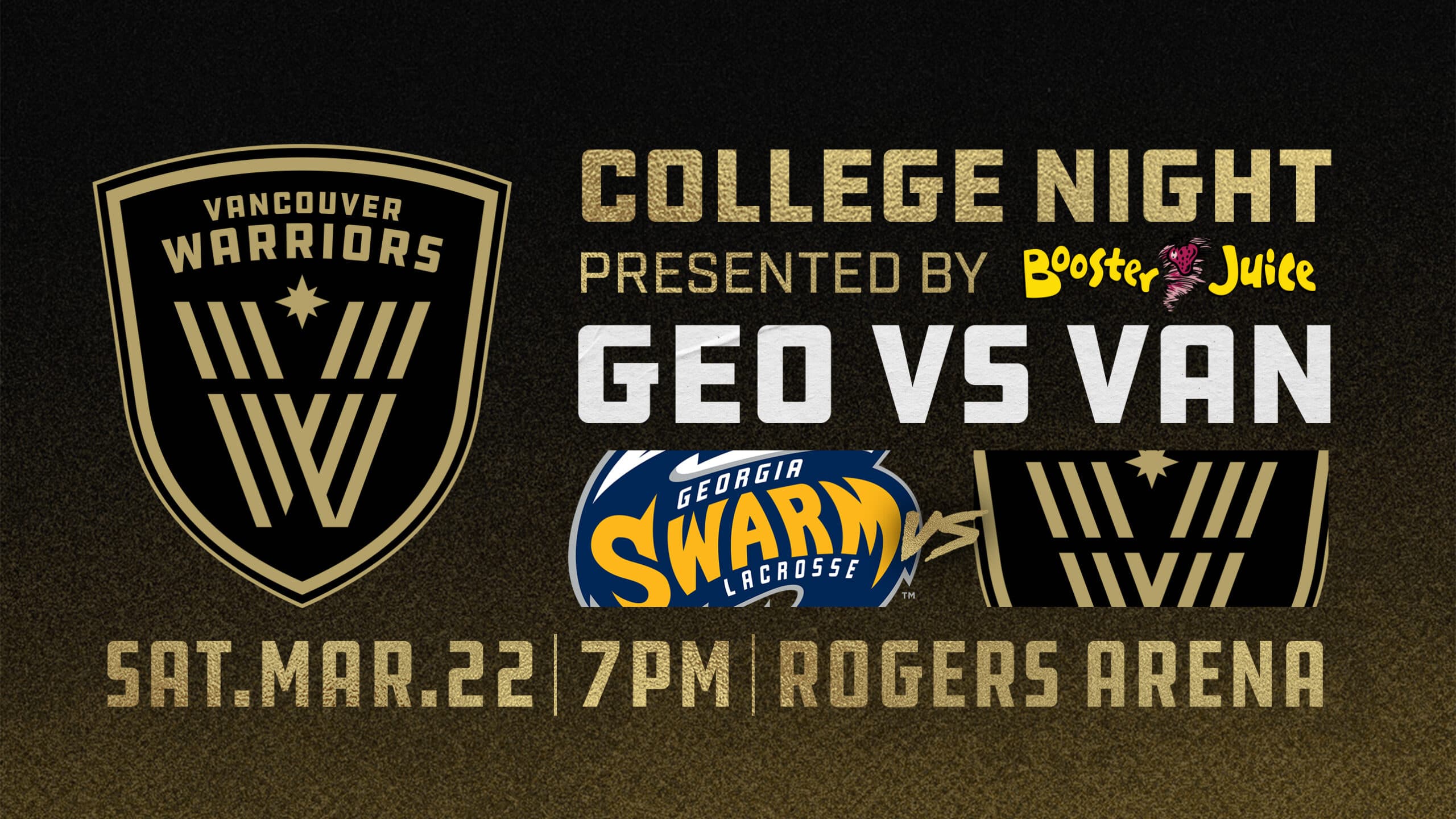 Vancouver, B.C. – College Night is back, Warriors fans! Take a break from your studies or rep your alma mater and join us for an action-packed lacrosse showdown on Saturday, March 22nd, as the Warriors go head-to-head with the Georgia Swarm!