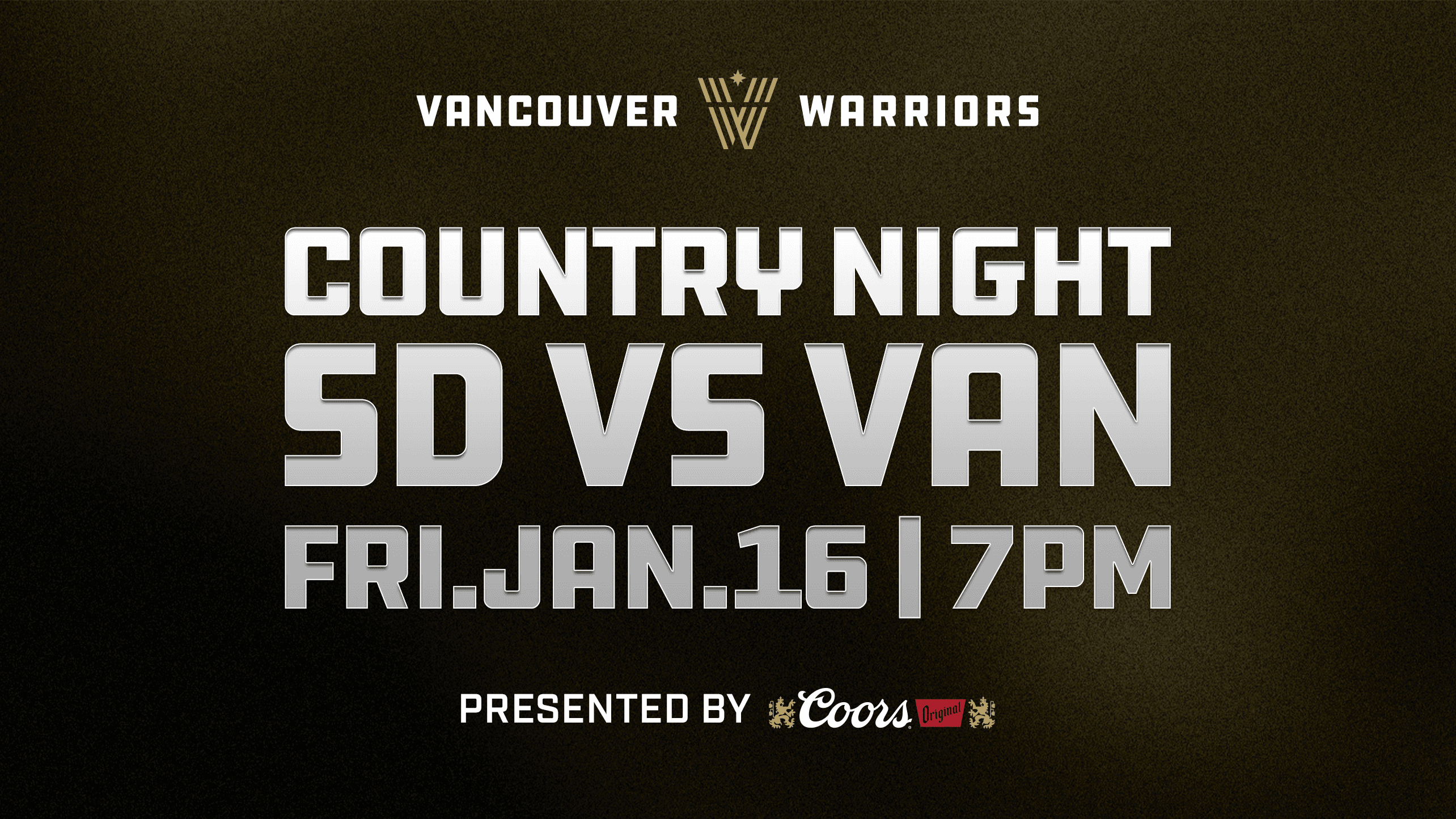Vancouver, B.C. – Time to get back in the saddle, Warriors fans! Fan-favourite Country Night, presented by Coors Original, returns to Rogers Arena on Friday, January 16, when the team hosts the San Diego Seals at 7:00pm.