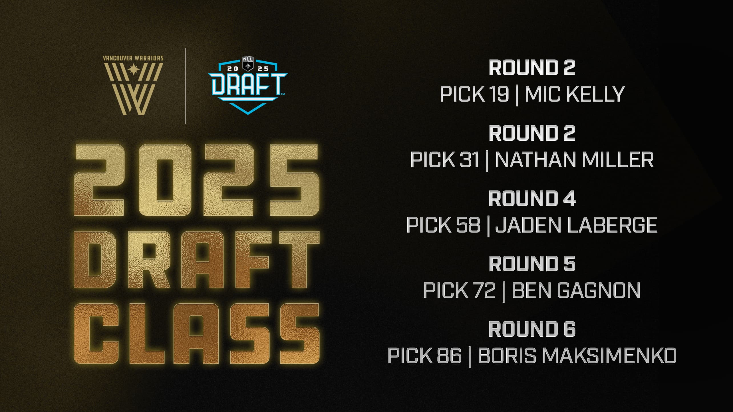 Vancouver, B.C. – The Vancouver Warriors selected a total of five players in the 2025 NLL Draft on Saturday, September 6, including Mic Kelly 19th overall (round two), Nathan Miller 31st overall (round two), Jaden Laberge 58th overall (round four), Ben Gagnon 72nd overall (round five), and Boris Maksimenko 86th overall (round six).